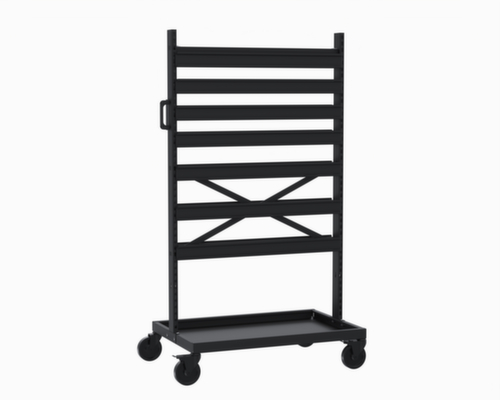 avec rails de suspension. utilisation bilatéral - exploitation optimale de l’espace et plus d’espace de rangement, car installation libre dans la pièce. Avec 14 rails à hauteur réglable pour le logement des bacs. structure en noir. Manœuvre et déplacement aisés grâce à 4 roulettes pivotantes. Les freins situés sur deux roulettes pivotantes offrent la stabilité souhaitée à tout moment. volume de livraison : sans bacs.
