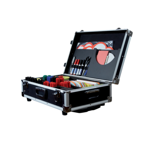"longDescription": "<h2>Moderationskoffer</h2><strong>praktischer Helfer im Moderationsbereich</strong><br><ul><li><strong>Alles in Einem</strong> - Marker, Pinn-Nadeln, Klebestift und Moderationskarten dabei</li><li><strong>Überall mithinzunehmen</strong> - mit Tragegriff- <strong>Set bestehend aus:</strong> 500 Rechtecke 95x205 mm, 250 Kreise Ø 95 mm, 250 Kreise Ø 140 mm, 250 Kreise Ø 195 mm, 250 Ovale 110x190 mm, 250 Rhomben 95x205 mm, 20 Moderationswolken 250x420 mm, 8 JumboMarker (je 2 schwarz, rot, blau, grün), je 15 FlipchartMarker in schwarz und rot, je 520 Markierungspunkte in rot und grün, 1 Kreppband, 1 Klebefilmabroller, 2 Klebestifte, 300 Pinnnadeln mit Rundkopf, 1 Nadelkissen, 1 Schere, 1 Cutter, 1 Zeigestab</li><li><strong>Für den täglichen Einsatz</strong> - Koffer aus Aluminium</li><li><strong>Mobil einsetzbar</strong> - mit 2 Rollen</li></ul>",