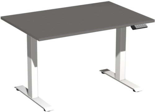 Die wichtigsten Maße des Gera Schreibtisches Elevate Basic auf einen Blick:Platte aus Holz mit pflegeleichter Melaminharzbeschichtung in Dekor Onyxgrau. Plattenform eckig. Kante mit schlagfestem ABS-Umleimer, der vor unschönen Rissen und Ausbrechen schützt. T-Fußgestell aus Stahl mit schlag- und kratzfester Pulverbeschichtung in weiß. Rohrform Vierkantrohr. Höhenverstellung durch Elektromotor mit Handschalter. Funktionen: Abspeichern und automatisches Abrufen von 3 programmierten Tischhöhen dank Memoryfunktion. Der automatische Kollisionsschutz stoppt sofort bei Widerstand von oben oder unten und sorgt somit für absolute Sicherheit. Gestell mit Bodenausgleichsschrauben. USB-C-Anschluss zum Laden von Mobilgeräten vorhanden. Die Füße sind unter der Platte mit einer Traverse verbunden. Diese erhöht so die Gesamtstabilität des Tisches und ein Durchbiegen der Platte wird verhindert.