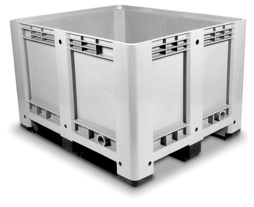 Die wichtigsten Maße des Großbehälters auf einen Blick:Aus schlagfestem Polyethylen in grau. Das Lagergut lässt sich durch die geschlossenen Wände vor Staub geschützt lagern und der Behälter lässt sich leicht reinigen, mit Verstärkungsrippen. Zur einfachen Reinigung ist der Boden geschlossen. Für das einfache Versetzen und Einfahren mit einem Stapler sorgen die 3 Kufen. Temperaturbeständig von -40 °C bis +60 °C.