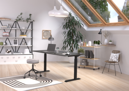 Platte aus Spanplatte mit kratzfester und pflegeleichter Melaminharzbeschichtung in Dekor graphit. Kante Alle Kanten sind durch schlagfeste ABS-Umleimer vor unschönen Rissen und Ausbrechen geschützt. C-Fußgestell aus Metall mit schlag- und kratzfester Pulverbeschichtung in schwarz. Höhenverstellung durch Mechanik. Gestell mit nivellierbaren Kunststoffgleitern, mit denen sich Bodenunebenheiten optimal ausbessern lassen.
