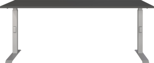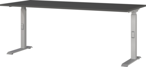 Platte aus Spanplatte mit kratzfester und pflegeleichter Melaminharzbeschichtung in Dekor graphit. Kante Alle Kanten sind durch schlagfeste ABS-Umleimer vor unschönen Rissen und Ausbrechen geschützt. C-Fußgestell aus Metall mit schlag- und kratzfester Pulverbeschichtung in silber. Höhenverstellung durch Mechanik. Gestell mit nivellierbaren Kunststoffgleitern, mit denen sich Bodenunebenheiten optimal ausbessern lassen.