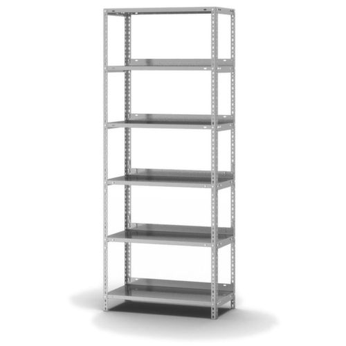 Für Ihre Sicherheit: nach DIN EN 15635 müssen Fachbodenregale ab einer 4-fachen Höhe zur Regaltiefe (Verhältnis 4:1) am Boden befestigt und gesichert werden. Die angegebenen Fachlasten gelten bei gleichmäßiger Lastverteilung. Zusätzliche Böden/Ebenen sind als Zubehör erhältlich und bis zur max. Feldlast erweiterbar.