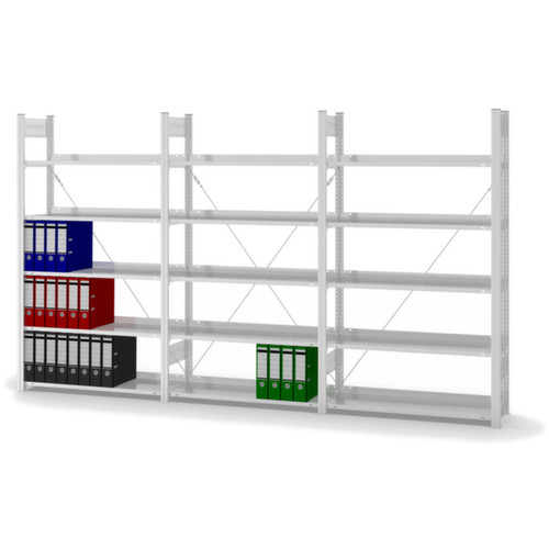 Die wichtigsten Maße des hofe Steckregals auf einen Blick:Auf 5 Ebene(n) mit Böden aus Stahlblech / 5 Ordnerhöhen könne Sie Akten, Ordner und sonstiges Büromaterial optimal organisieren. Ebenen mit Anschlagkante und seitlicher Bodenabkantung der oberen Fachebene gegen das Herausfallen von Ordnern. Fachhöhen je nach Einsatzzweck und Ihrem Bedarf im Raster von 25 mm verstellbar. Nutzung einseitig - zur Aufstellung an der Wand konzipiert. Hohe Stabilität in Längsrichtung durch Diagonalverstrebungen. Konstruktion aus Stahl. Ständer verzinkt mit Kunststoffbeschichtung in RAL7035 Lichtgrau. Ebenen verzinkt mit Kunststoffbeschichtung in RAL7035 Lichtgrau.