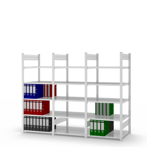 Die wichtigsten Maße des hofe Steckregals auf einen Blick:Auf 5 Ebene(n) mit Böden aus Stahlblech / 5 Ordnerhöhen könne Sie Akten, Ordner und sonstiges Büromaterial optimal organisieren. Ebenen mit steckbarer Mittel-Anschlagkante und seitlicher Bodenabkantung der oberen Fachebene gegen das Herausfallen von Ordnern. Fachhöhen je nach Einsatzzweck und Ihrem Bedarf im Raster von 25 mm verstellbar. Nutzung beidseitig - flexible Aufstellung frei im Raum möglich. Hohe Stabilität durch Aussteifungstraversen. Konstruktion aus Stahl. Ständer verzinkt mit Kunststoffbeschichtung in RAL7035 Lichtgrau. Ebenen verzinkt mit Kunststoffbeschichtung in RAL7035 Lichtgrau.
