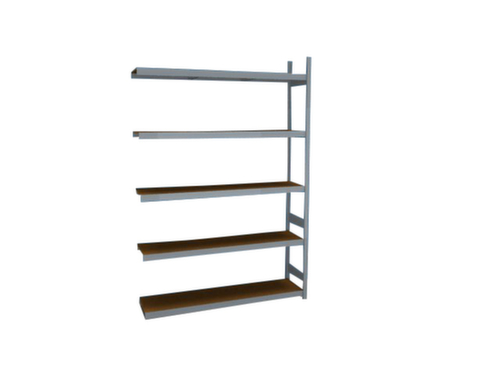 Die wichtigsten Maße des hofe Weitspannregals auf einen Blick:5 Ebene(n) mit Holzboden. Ebenen mit Verstärkung durch Unterzüge. Fachhöhen je nach Einsatzzweck und Ihrem Bedarf im Raster von 25 mm verstellbar. Nutzung einseitig - zur Aufstellung an der Wand konzipiert. Durch gesickte Tiefen-Verbindungsblechen und Stahl-Fußplatten ist das Regal besonders standfest. Obere Profilabdeckkappen sorgen für einen sauberen Abschluss. Konstruktion aus Stahl, Ständer mit korrosionsschützender Zinkbeschichtung, Traversen mit korrosionsschützender Zinkbeschichtung.