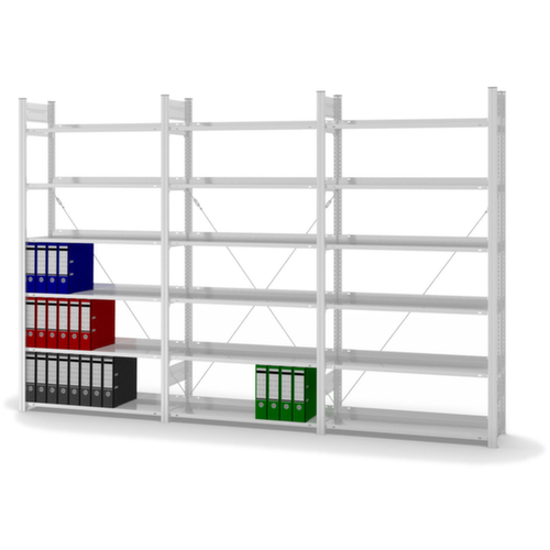 Die wichtigsten Maße des hofe Steckregals auf einen Blick:Auf 6 Ebene(n) mit Böden aus Stahlblech / 6 Ordnerhöhen könne Sie Akten, Ordner und sonstiges Büromaterial optimal organisieren. Ebenen mit Anschlagkante und seitlicher Bodenabkantung der oberen Fachebene gegen das Herausfallen von Ordnern. Fachhöhen je nach Einsatzzweck und Ihrem Bedarf im Raster von 25 mm verstellbar. Nutzung einseitig - zur Aufstellung an der Wand konzipiert. Hohe Stabilität in Längsrichtung durch Diagonalverstrebungen. Konstruktion aus Stahl. Ständer verzinkt mit Kunststoffbeschichtung in RAL7035 Lichtgrau. Ebenen verzinkt mit Kunststoffbeschichtung in RAL7035 Lichtgrau.