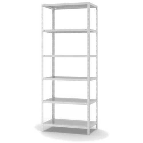 Die wichtigsten Maße des hofe Lagerregals auf einen Blick:6 Ebene(n) mit Stahlboden. 3-fache Sicherheitsabkantung mit 40 mm Höhe und geschlossenen Eckbereichen sorgen für eine hohe Stabilität und Sicherheit gegen Verletzungen. Fachhöhen je nach Einsatzzweck und Ihrem Bedarf im Raster von 25 mm verstellbar. Nutzung einseitig - zur Aufstellung an der Wand konzipiert. Konstruktion aus Stahl, Ständer verzinkt mit Kunststoffbeschichtung in RAL7035 Lichtgrau, Ebenen verzinkt mit Kunststoffbeschichtung in RAL7035 Lichtgrau.