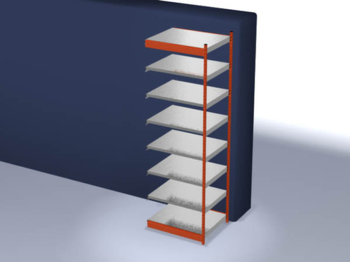 Die wichtigsten Maße des hofe Lagerregals auf einen Blick:7 Ebene(n) mit Stahlboden. Ebenen mit Sicherheitskantung zum Schutz vor Verletzungen. 3-fache Sicherheitsabkantung mit 40 mm Höhe sorgen für eine hohe Stabilität und Sicherheit gegen Verletzungen. Fachhöhen je nach Einsatzzweck und Ihrem Bedarf im Raster von 50 mm verstellbar. Aufstellwinkel gerade. Nutzung einseitig - zur Aufstellung an der Wand konzipiert. Hohe Stabilität durch Längstraversen. Konstruktion aus Stahl, Ständer mit strapazierfähiger Kunststoffbeschichtung in RAL2004 Reinorange, Ebenen mit korrosionsschützender Zinkbeschichtung.