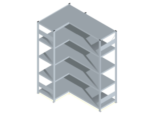 Die wichtigsten Maße des hofe Lagerregals auf einen Blick:5 Ebene(n) mit Stahlboden. 3-fache Sicherheitsabkantung mit 40 mm Höhe und geschlossenen Eckbereichen sorgen für eine hohe Stabilität und Sicherheit gegen Verletzungen. Fachhöhen je nach Einsatzzweck und Ihrem Bedarf im Raster von 25 mm verstellbar. Aufstellwinkel links und rechts. Nutzung einseitig - zur Aufstellung an der Wand konzipiert. Hohe Stabilität in Längsrichtung durch Diagonalverstrebungen. Durch gesickte Tiefen-Verbindungsblechen und Stahl-Fußplatten ist das Regal besonders standfest. Obere Profilabdeckkappen sorgen für einen sauberen Abschluss. Konstruktion aus Stahl, Ständer mit korrosionsschützender Zinkbeschichtung, Ebenen mit korrosionsschützender Zinkbeschichtung.