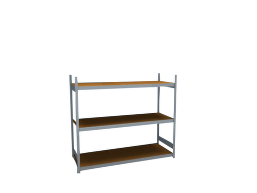 Die wichtigsten Maße des hofe Weitspannregals auf einen Blick:3 Ebene(n) mit Holzboden. Ebenen mit Verstärkung durch Unterzüge. Fachhöhen je nach Einsatzzweck und Ihrem Bedarf im Raster von 25 mm verstellbar. Nutzung einseitig - zur Aufstellung an der Wand konzipiert. Durch gesickte Tiefen-Verbindungsblechen und Stahl-Fußplatten ist das Regal besonders standfest. Obere Profilabdeckkappen sorgen für einen sauberen Abschluss. Konstruktion aus Stahl, Ständer mit korrosionsschützender Zinkbeschichtung, Traversen mit korrosionsschützender Zinkbeschichtung.