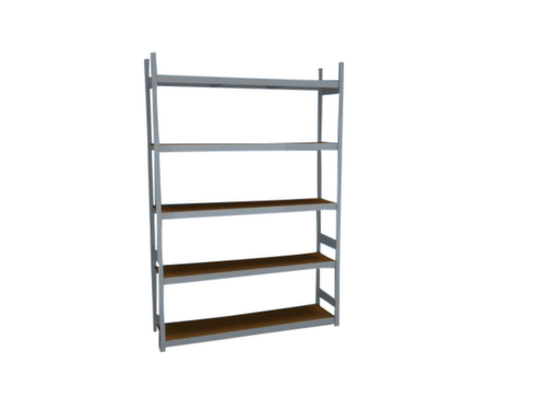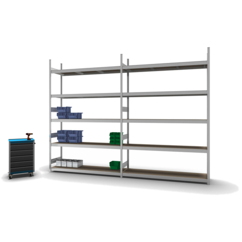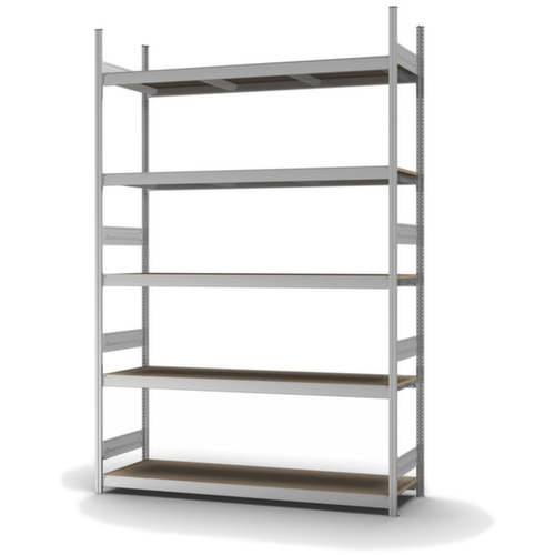 Die wichtigsten Maße des hofe Weitspannregals auf einen Blick:5 Ebene(n) mit Holzboden. Ebenen mit Verstärkung durch Unterzüge. Fachhöhen je nach Einsatzzweck und Ihrem Bedarf im Raster von 25 mm verstellbar. Nutzung einseitig - zur Aufstellung an der Wand konzipiert. Durch gesickte Tiefen-Verbindungsblechen und Stahl-Fußplatten ist das Regal besonders standfest. Obere Profilabdeckkappen sorgen für einen sauberen Abschluss. Konstruktion aus Stahl, Ständer mit korrosionsschützender Zinkbeschichtung, Traversen mit korrosionsschützender Zinkbeschichtung.
