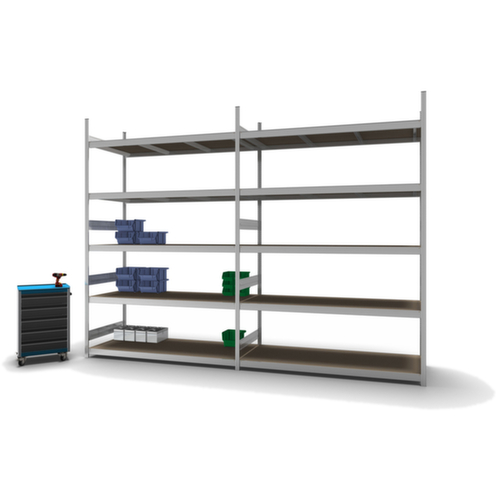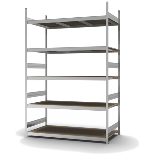 Die wichtigsten Maße des hofe Weitspannregals auf einen Blick:5 Ebene(n) mit Holzboden. Ebenen mit Verstärkung durch Unterzüge. Fachhöhen je nach Einsatzzweck und Ihrem Bedarf im Raster von 25 mm verstellbar. Nutzung einseitig - zur Aufstellung an der Wand konzipiert. Durch gesickte Tiefen-Verbindungsblechen und Stahl-Fußplatten ist das Regal besonders standfest. Obere Profilabdeckkappen sorgen für einen sauberen Abschluss. Konstruktion aus Stahl, Ständer mit korrosionsschützender Zinkbeschichtung, Traversen mit korrosionsschützender Zinkbeschichtung.