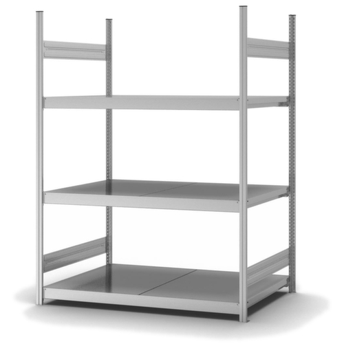 Die wichtigsten Maße des hofe Weitspannregals auf einen Blick:3 Ebene(n) mit Stahlboden. Fachhöhen je nach Einsatzzweck und Ihrem Bedarf im Raster von 25 mm verstellbar. Nutzung beidseitig - flexible Aufstellung frei im Raum möglich. Durch gesickte Tiefen-Verbindungsblechen und Stahl-Fußplatten ist das Regal besonders standfest. Obere Profilabdeckkappen sorgen für einen sauberen Abschluss. Konstruktion aus Stahl, Ständer mit korrosionsschützender Zinkbeschichtung, Ebenen mit korrosionsschützender Zinkbeschichtung,