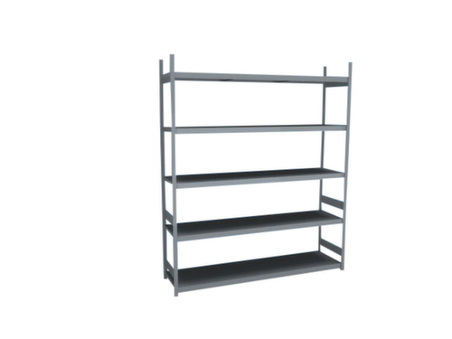 Die wichtigsten Maße des hofe Weitspannregals auf einen Blick:5 Ebene(n) mit Stahlboden. Fachhöhen je nach Einsatzzweck und Ihrem Bedarf im Raster von 25 mm verstellbar. Nutzung beidseitig - flexible Aufstellung frei im Raum möglich. Durch gesickte Tiefen-Verbindungsblechen und Stahl-Fußplatten ist das Regal besonders standfest. Obere Profilabdeckkappen sorgen für einen sauberen Abschluss. Konstruktion aus Stahl, Ständer mit korrosionsschützender Zinkbeschichtung, Ebenen mit korrosionsschützender Zinkbeschichtung,
