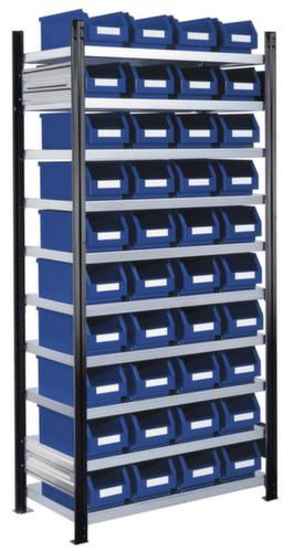 Die wichtigsten Maße des Kappes Behälterregals RasterPlan® auf einen Blick:Übersichtliche Kleinteilelagerung auf 10 Ebenen mit Stahlboden und 40 Kästen. Fachhöhen je nach Einsatzzweck und Ihrem Bedarf im Raster von 25 mm verstellbar. Nutzung einseitig - zur Aufstellung an der Wand konzipiert. Konstruktion aus Stahl. Ständer mit strapazierfähiger Kunststoffbeschichtung in anthrazitgrau. Ebenen mit korrosionsschützender Zinkbeschichtung.