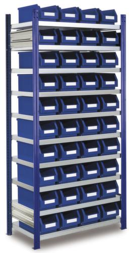 Die wichtigsten Maße des Kappes Behälterregals auf einen Blick:Übersichtliche Kleinteilelagerung auf 10 Ebenen mit Stahlboden und 40 Kästen. Ebene(n) mit Sicherheitskantung zum Schutz vor Verletzungen. Nutzung einseitig - zur Aufstellung an der Wand konzipiert. Konstruktion aus Stahl. Ständer mit schlag- und kratzfester Pulverbeschichtung in RAL5010 Enzianblau.