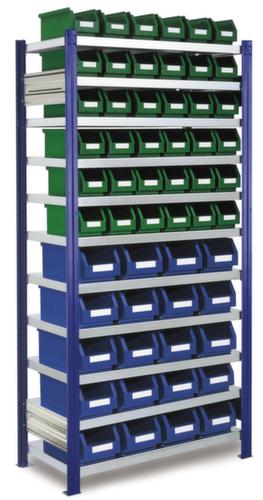 Die wichtigsten Maße des Kappes Behälterregals auf einen Blick:Übersichtliche Kleinteilelagerung auf 11 Ebenen mit Stahlboden und 56 Kästen. Ebene(n) mit Sicherheitskantung zum Schutz vor Verletzungen. Nutzung einseitig - zur Aufstellung an der Wand konzipiert. Konstruktion aus Stahl. Ständer mit schlag- und kratzfester Pulverbeschichtung in RAL5010 Enzianblau.