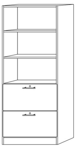 Die wichtigsten Maße des Kombiregals Sina auf einen Blick:3 Ordnerhöhe(n) als Regal. 2 HR-Auszüge. Durch Zylinderschloss vor unbefugtem Zugriff geschützt. Ebenen mit Holzboden. Fachhöhen je nach Einsatzzweck und Ihrem Bedarf im Raster von 32 mm verstellbar. Konstruktion aus Holz mit pflegeleichter Melaminharzbeschichtung. Korpus in lichtgrau, Ebenen in lichtgrau. Unterbau mit höheneinstellbaren Sockelfüßen zur variablen Anpassung an unebenen Untergrund, z. B. durch Teppichkanten.