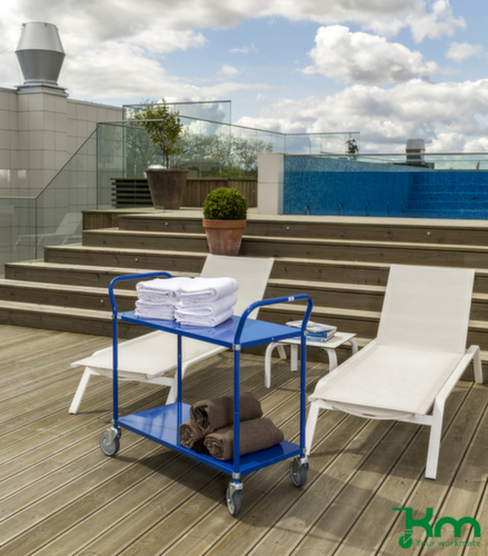 Etage(n) aus Metall mit schlag- und kratzfester Pulverbeschichtung in grün. Etage(n) mit Schutzkante. Schiebebügel hoch. Gestell mit schlag- und kratzfester Pulverbeschichtung in grün. Konstruktion aus Stahl. Leicht zu manövrieren und verfahren durch 4 Lenkrollen. Rad Ø 125 mm. Räder mit bodenschonender TPE-Bereifung auf bruchsicherer und robuster Polypropylen-Felge. Naben mit Präzisionskugellager. Gehäuse aus Stahl. Montagehinweis: Böden mit Aufkantung nach unten oder oben montierbar.