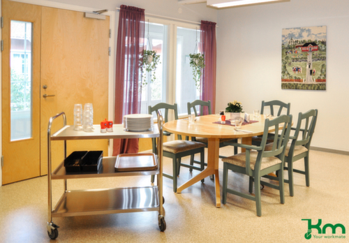 Etage(n) aus Edelstahl mit Abrollrand. Edelstahlkonstruktion. Leicht zu manövrieren und verfahren durch 4 Lenkrollen, 2 Rollen mit Feststellern. Rad Ø 100 mm. Räder mit bodenschonender TPE-Bereifung. Gehäuse aus Stahl. Naben mit Schwenklager mit zweifachem Kugel-Drehkranz. Dadurch wird eine 360°-Drehung ermöglicht. Radanordnung rechteckig.Unser Kundenservice-Team steht Ihnen gerne zur Verfügung.