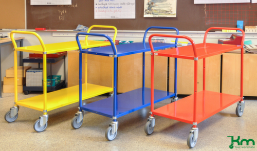 Etage(n) aus Metall mit schlag- und kratzfester Pulverbeschichtung. Etage(n) mit Schutzkante. Schiebebügel hoch. Gestell elektrolytisch verzinkt in silber. Konstruktion aus Stahl. Leicht zu manövrieren und verfahren durch 4 Lenkrollen, Feststeller an zwei Lenkrollen gewähren bei Bedarf stets einen sicheren Stand. Rad Ø 125 mm. Räder mit bodenschonender TPE-Bereifung auf bruchsicherer und robuster Polypropylen-Felge. Naben mit Präzisionskugellager. Gehäuse aus Stahl. Montagehinweis: Böden mit Aufkantung nach unten oder oben montierbar.