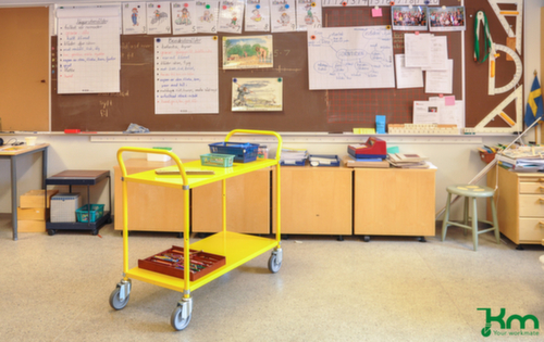 Etage(n) aus Metall mit schlag- und kratzfester Pulverbeschichtung in gelb. Etage(n) mit Schutzkante. Schiebebügel hoch. Gestell mit schlag- und kratzfester Pulverbeschichtung. Konstruktion aus Stahl. Leicht zu manövrieren und verfahren durch 4 Lenkrollen. Rad Ø 125 mm. Räder mit bodenschonender TPE-Bereifung auf bruchsicherer und robuster Polypropylen-Felge. Naben mit Präzisionskugellager. Gehäuse aus Stahl. Montagehinweis: Böden mit Aufkantung nach unten oder oben montierbar.
