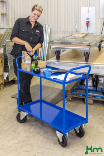 Etage(n) aus Stahl elektrolytisch verzinkt. Etage(n) mit Abrollrand. Schiebebügel hoch. Gestell elektrolytisch verzinkt. Konstruktion aus Stahl (fest verschweißt. Das gibt der Struktur die nötige Robustheit und Stabilität, um für eine Vielzahl von Anwendungsmöglichkeiten gewappnet zu sein). Die untergebauten 2 Lenk- und 2 Bockrollen ermöglichen ein müheloses Bewegen mit hoher Spursicherheit auf geraden und kurvigen Strecken bei wenig Kraftaufwand. Rad Ø 160 mm. Räder mit pannensicherer, bodenschonender Vollgummi-Bereifung auf bruchsicherer und robuster Polypropylen-Felge. Gehäuse aus Stahl. Radanordnung parallel.