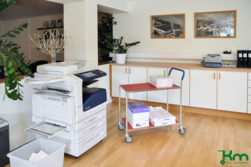 Etage(n) aus Stahl mit abriebfester und feuchtigkeitsbeständiger Melaminbeschichtung in Birke. Schiebebügel hoch, mit Kunststoffummantelung. Gestell elektrolytisch verzinkt in silber. Konstruktion aus Stahl. Leicht zu manövrieren und verfahren durch 4 Lenkrollen. Rad Ø 100 mm. Räder mit bodenschonender TPE-Bereifung auf bruchsicherer und robuster Polypropylen-Felge. Naben mit Präzisionskugellager. Gehäuse aus Stahl.