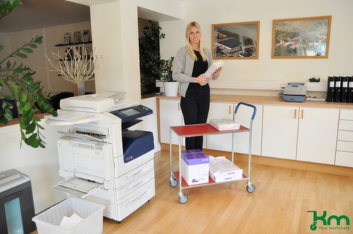 Etage(n) aus Stahl mit Kunststoffbelag in Buche. Schiebebügel hoch, mit Kunststoffummantelung. Gestell mit schlag- und kratzfester Pulverbeschichtung in silber. Konstruktion aus Stahl. Leicht zu manövrieren und verfahren durch 4 Lenkrollen. Rad Ø 100 mm. Räder mit bodenschonender TPE-Bereifung auf bruchsicherer und robuster Polypropylen-Felge. Naben mit Präzisionskugellager. Gehäuse aus Stahl.