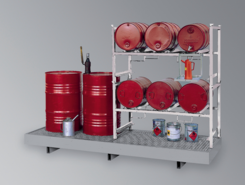 "longDescription": "<h2>Abfüllregal und Stapelgestell</h2><strong>sofort einsatzfähige Angebote</strong><br><ul><li>Geeignet für wassergefährdende und brennbare Stoffe</li><li><strong>Korrosionsgeschützt und stabil</strong> - Gestell aus verzinktem Stahl</li><li><strong>Einfacher Transport</strong> - ab 1390 mm Breite mit Staplereinfahrtaschen</li></ul><br><strong>Sie haben die Wahl:</strong><br><ul><li><strong>Praktische Komplett-Angebote oder individuelle Einzel-Angebote</strong> - mit fest aufgeschweißten Fassauflagen oder Gitterrostböden</li><li><strong>Passende Wannen</strong> - wahlweise als Einschub-, Stand- oder Kombi-Standwanne</li></ul><br><strong>Standwanne</strong><br><ul><li><strong>Volles Auffangvolumen nutzbar</strong> - mit herausnehmbarem und feuerverzinktem Gitterrost</li><li><strong>Sicherer Stand</strong> - Gitterrost mit Kantung, auf der das Stapelregal aufgeschraubt wird</li><li><strong>Für den Staplertransport geeignet</strong> durch praktische Unterfahrhöhe</li></ul><br><strong>Bestimmungen!</strong><br><br>Bauweise der Wannen behördlich zugelassen. Einsatz für gewässergefährdende, entzündbare (Flammpunkt > 55°C) und aggressive Stoffe zur Lagerung unter Dach.<br>",