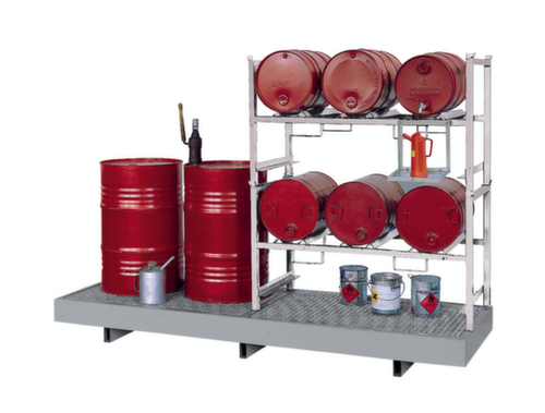 "longDescription": "<h2>Abfüllregal und Stapelgestell</h2><strong>sofort einsatzfähige Angebote</strong><br><ul><li>Geeignet für wassergefährdende und brennbare Stoffe</li><li><strong>Korrosionsgeschützt und stabil</strong> - Gestell aus verzinktem Stahl</li><li><strong>Einfacher Transport</strong> - ab 1390 mm Breite mit Staplereinfahrtaschen</li></ul><br><strong>Sie haben die Wahl:</strong><br><ul><li><strong>Praktische Komplett-Angebote oder individuelle Einzel-Angebote</strong> - mit fest aufgeschweißten Fassauflagen oder Gitterrostböden</li><li><strong>Passende Wannen</strong> - wahlweise als Einschub-, Stand- oder Kombi-Standwanne</li></ul><br><strong>Standwanne</strong><br><ul><li><strong>Volles Auffangvolumen nutzbar</strong> - mit herausnehmbarem und feuerverzinktem Gitterrost</li><li><strong>Sicherer Stand</strong> - Gitterrost mit Kantung, auf der das Stapelregal aufgeschraubt wird</li><li><strong>Für den Staplertransport geeignet</strong> durch praktische Unterfahrhöhe</li></ul><br><strong>Bestimmungen!</strong><br><br>Bauweise der Wannen behördlich zugelassen. Einsatz für gewässergefährdende, entzündbare (Flammpunkt > 55°C) und aggressive Stoffe zur Lagerung unter Dach.<br>",