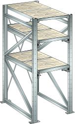 Grundregal mit 2 Ständerrahmen, 2 Auszugböden, 1 Kopfboden, Diagonalverstrebungen, Bodenverankerung und Bodenausgleichsplatten-Set