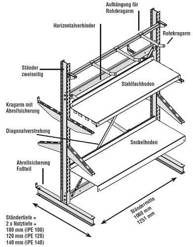 Je nachdem, welche Höhe, Breite und Tiefe Sie sich für Ihr Lager vorstellen, sind natürlich auch die Traglasten pro Ständer sowie die verschiedenen Lagerebenen von immenser Bedeutung. Einfacher ist es bei den kleineren Kragarmregalen, sich hierbei für ein Komplett-Angebot zu entscheiden. Für größere Lagerflächen, gerade bei den Schwerlast-Kragarmregalen, ist es aber notwendig, sich individuell Ständer, Kragarme, Rahmen, Tiefenauflagen, Horizontalverbinder sowie Diagonalverbände selbst zusammen zu stellen. Eine ausführliche Erklärung über die einzelnen Bestandteile eines Kragarmregals entnehmen Sie bitte dieser Grafik