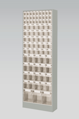 "metaDescription": "Magazinschrank mit Klappkästen, 80 Kästen, transparent - HxBxT 1820x634x200mm, 80 Kästen, Gehäuse lackiert",