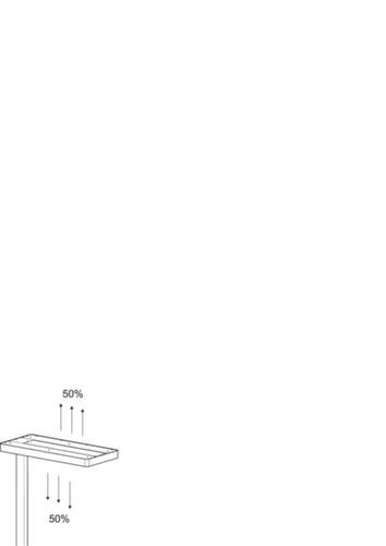Leuchtenkopf mit ca. 50 % Abstrahlung nach oben und unten und Diffusor für einen geringen Schattenwurf. Höhe 1960 mm, Leuchtenkopf Länge x Breite 610 x 280 mm, Standfuß Länge x Breite 450 x 300 mm, mit Ausschnitt für Tischbein. Aus Aluminium in silber. Kabel 2,5 m lang.