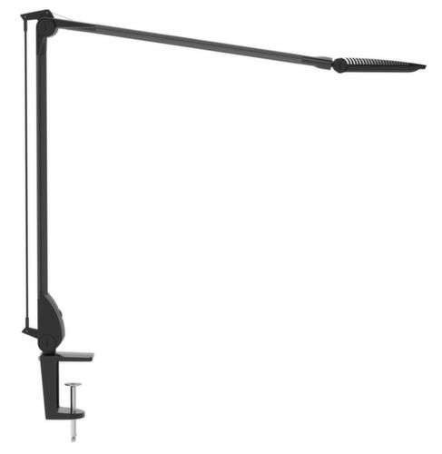 Leuchtenkopf mit Diffusor für geringen Schattenwurf. Ausgestattet mit Ein-/Aus-Schalter, Kabel mit Stecker. Höhe 1960 mm, Leuchtenkopf Länge x Breite 792 x 240 mm, Standfuß Länge x Breite 455 x 270 mm, mit Ausschnitt für Tischbein. Aus Aluminium in silber. Kabel 2,5 m lang.