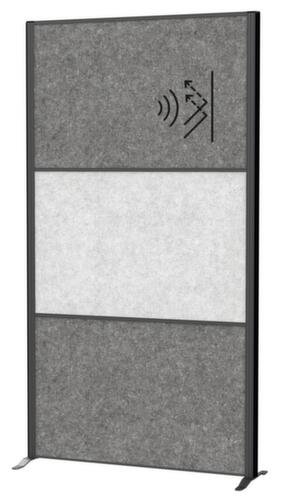 Zum Aufstellen auf dem Boden. Wand aus Polyestervlies (als optimales Dämmmaterial) in dunkelgrau/hellgrau (aufgeteilt in 2 Wände in dunkelgrau und 1 Wand in hellgrau). Oberfläche pinnbar. Rahmen aus Aluminium in anthrazit. Unterbau mit Standfuß mit Nivellierfuß zum Ausgleich von Bodenunebenheiten. Jederzeit erweiterbar: Mehrere Stellwände können lückenlos über Klettverbindungen aneinander gereiht werden.