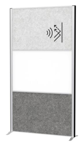 Zum Aufstellen auf dem Boden. Wand aus Polyestervlies (Akustikwände) und Stahlblech (Whiteboard) in hellgrau/dunkelgrau/weiß (aufgeteilt in 1 Wand in hellgrau, 1 Wand in dunkelgrau und Whiteboard in weiß). Oberfläche pinnbar und magnethaftend. Rahmen aus Aluminium in silber. Unterbau mit Standfuß mit Nivellierfuß zum Ausgleich von Bodenunebenheiten. Jederzeit erweiterbar: Mehrere Stellwände können lückenlos über Klettverbindungen aneinander gereiht werden.