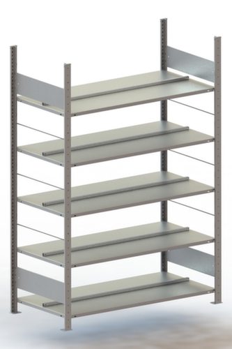 Die wichtigsten Maße des META Steckregals auf einen Blick:Auf 5 Ebene(n) mit Stahlboden / 4 Ordnerhöhen können Sie Akten, Ordner und sonstiges Büromaterial optimal organisieren. Ebenen mit steckbarer Mittel-Anschlagkante gegen das Herausfallen von Ordnern. Fachhöhen je nach Einsatzzweck und Ihrem Bedarf im Raster von 25 mm verstellbar. M-förmige Längskanäle mit 5-facher Abkantung sorgen für eine hohe Stabitlität und Sicherheit gegen Verletzungen. Nutzung beidseitig - flexible Aufstellung frei im Raum möglich. Hohe Stabilität durch Längsriegel. Konstruktion aus Stahl. Ständer verzinkt mit schlag- und kratzfester Pulverbeschichtung in RAL7035 Lichtgrau. Ebenen verzinkt mit schlag- und kratzfester Pulverbeschichtung in RAL7035 Lichtgrau.