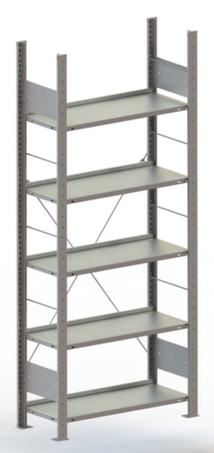 Die wichtigsten Maße des META Steckregals auf einen Blick:Auf 5 Ebene(n) mit Stahlboden / 4 Ordnerhöhen könne Sie Akten, Ordner und sonstiges Büromaterial optimal organisieren. Ebenen mit hinterer Anschlagkante gegen das Herausfallen von Ordnern. Fachhöhen je nach Einsatzzweck und Ihrem Bedarf im Raster von 25 mm verstellbar. M-förmige Längskanäle mit 5-facher Abkantung sorgen für eine hohe Stabitlität und Sicherheit gegen Verletzungen. Nutzung einseitig - zur Aufstellung an der Wand konzipiert. Hohe Stabilität in Längsrichtung durch Diagonalverstrebungen. Konstruktion aus Stahl. Ständer mit korrosionsschützender Zinkbeschichtung. Ebenen mit korrosionsschützender Zinkbeschichtung.