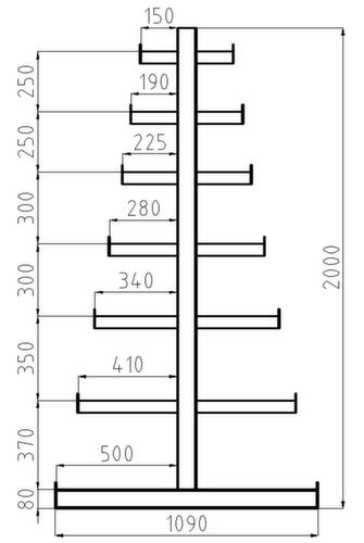 Die wichtigsten Maße des META Kragarmregals Atlas ST auf einen Blick:Nutzung beidseitig - flexible Aufstellung frei im Raum möglich. 7 Lagerebenen. 6 Ebene(n) mit Kragarm, mit Abrollsicherung. Traglast je Arm 150 kg. Verschieden lange Arme in konischer Form, gerade ausgerichtet. Nutztiefe 150 mm. Konstruktion aus Stahl. Ständer sandgestrahlt mit Pulverbeschichtung in RAL5010 Enzianblau. Kragarme sandgestrahlt mit Pulverbeschichtung in RAL5010 Enzianblau.