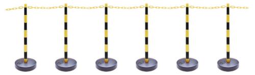"longDescription": "<h2>Kettenständer-Set</h2><strong>mobiles Komplett-Set zum schnellen Absperren</strong><br><ul><li><strong>Set bestehend aus:</strong> 6 Kettenständern, 10 m Kette, 10 Verbindungsgliedern, 10 Einhängehaken</li><li>Mit integrierter Kettenaufnahme</li><li><strong>Leicht und unempfindlich</strong> - Pfosten aus Kunststoff</li></ul><br><strong>Sie haben die Wahl:</strong><br><ul><li><strong>Für jeden Zweck den richtigen Fuß</strong> - dreieckig aus Kunststoff mit Beton gefüllt, rund aus Kunststoff individuell befüllbar oder quadratisch aus Hartgummi</li></ul><br>Das Kettenständer-Set ist perfekt geeignet zum einfachen und schnellen mobilen Absperren. Mit den im Lieferumfang enthaltenen 6 Kettenständern, 10 m Kette, 10 Verbindungsgliedern und 10 Einhängehaken kann jeder beliebige Bereich abgesperrt werden. Durch die Höhe von 870 mm ist die Absperrung für Autofahrer und Fußgänger immer gut sichtbar. <br><br>Die Pfosten aus Kunststoff haben einem Durchmesser von 40 mm und sind in den Farbkombinationen rot/weiß oder gelb/schwarz erhältlich, wodurch eine zusätzliche Signalwirkung entsteht. Außerdem verfügen die Kettenständer über eine integrierte Kettenaufnahme. Die Ständer sind maximal im Abstand von 2 m zu stellen. Je nach Einsatzzweck können Sie zwischen verschiedenen Fußausführungen wählen.<br>",