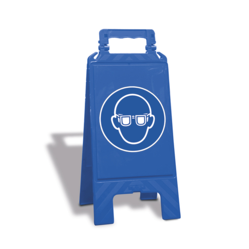 "metaDescription": "Moravia Warnaufsteller, Bodenaufsteller - Augenschutz benutzen, Bodenaufsteller, Kunststoff, blau, HxBxT 600x275x270mm",