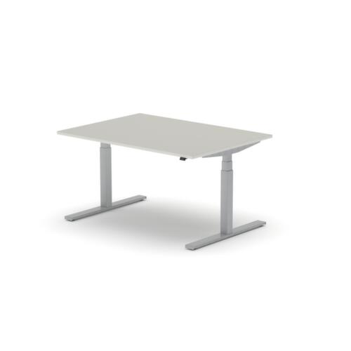 Platte aus Spanplatte mit pflegeleichter Melaminharzbeschichtung in Dekor MB White Grey. Plattenform rechteckig. T-Fußgestell in RAL9006 Weißaluminium. Höhenverstellung durch Elektromotor mit Handschalter und Display. Funktionen: Abspeichern und automatisches Abrufen von programmierten Tischhöhen dank Memoryfunktion. Mit Eurostecker.