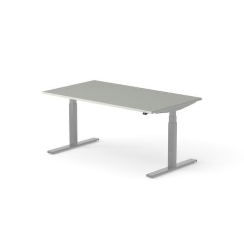 Platte aus Spanplatte mit pflegeleichter Melaminharzbeschichtung in Dekor MP Platinum. Plattenform rechteckig. T-Fußgestell in RAL9006 Weißaluminium. Höhenverstellung durch Elektromotor mit Handschalter und Display. Funktionen: Abspeichern und automatisches Abrufen von programmierten Tischhöhen dank Memoryfunktion. Mit Eurostecker.