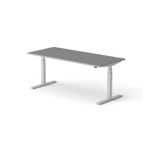 Platte aus Spanplatte mit pflegeleichter Melaminharzbeschichtung in Dekor MS Slate. Plattenform rechteckig. T-Fußgestell in RAL9006 Weißaluminium. Höhenverstellung durch Elektromotor mit Handschalter und Display. Funktionen: Abspeichern und automatisches Abrufen von programmierten Tischhöhen dank Memoryfunktion. Mit Eurostecker.