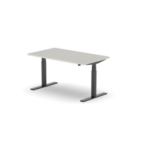 Platte aus Spanplatte mit pflegeleichter Melaminharzbeschichtung in Dekor MB White Grey. Plattenform rechteckig. T-Fußgestell in RAL9005 Tiefschwarz. Höhenverstellung durch Elektromotor mit Handschalter und Display. Funktionen: Abspeichern und automatisches Abrufen von programmierten Tischhöhen dank Memoryfunktion. Mit Eurostecker.