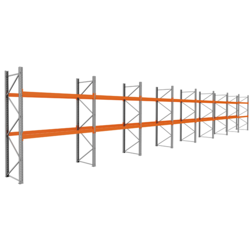 Die wichtigsten Maße des Palettenregals auf einen Blick:8 Regalfelder mit je 2 Ebene(n) mit Traversen bieten Lagerkapazität für insgesamt 72 Paletten. Fachhöhen je nach Einsatzzweck und Ihrem Bedarf im Raster von 70 mm verstellbar. Jedes Regalfeld bietet 9 Palettenstellplätze (inkl. Bodenlagerung). Einlagerung längs. Die Längstraversen werden mit Dreihakenklauen und Aushebesicherung in den Ständerrahmen eingehangen. Nutzung einseitig - zur Aufstellung an der Wand konzipiert. Hohe Stabilität durch Auflageträger mit geschlossenen Kastenprofilen. Konstruktion aus Stahl. Ständer mit korrosionsschützender Zinkbeschichtung. Ebenen in RAL2004 Reinorange.