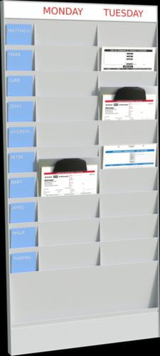 "longDescription": "<h2>Büroplaner</h2><strong>für noch mehr Ordnung und Planung im Büroalltag</strong><br><ul><li>Modulares System ermöglicht Individualität und endlose Erweiterung</li><li><strong>Robust und schlagfest</strong> - aus Polystyrol</li><li><strong>Optimale Übersicht</strong> - Montage im Hochformat</li><li>Zur Wandmontage vorbereitet durch Befestigungslöcher</li><li><strong>Einfach zu bestücken</strong> - mit fest montierten Ablagen</li></ul><br>Noch mehr Ordnung und Planung im Büro, im Betrieb, in der Werkstatt und der Produktion!<br><br>Für alle sichtbar und zugreifbar - der Wandplaner ist ideal, um klare Aufgaben zu verteilen. Oder Sie benutzen ihn als Auftragsplaner. Vielfältig einsetzbar schafft der Büroplaner eine gute Übersicht.<br><br>Das Grundmodul besitzt 10 Fächer für, beispielsweise, Namenskarten. So können für einzelne Mitarbeiter spezielle Aufgaben, Informationen oder Termine hinterlegt werden. Dadurch wird direkt sichtbar, ob noch was zu erledigen ist und es verschwindet nichts unter Bergen von Ablagen.<br>Das Grundelement besitzt 20 weitere Fächer. Wahlweise im DIN A4-Format oder DIN A5-Format. Das Basismodul ist jederzeit um 20 oder 10 Fächer erweiterbar. Die Anbauelemente werden einfach daneben an der Wand befestigt. Zur schnellen Montage sind die Befestigungslöcher bereits vorhanden.<br><br>Die Sortiertafel besteht komplett aus Polystyrol, dementsprechend auch die Fächer. Die Fächer sind durchgefärbt, jedoch gucken die Papiere oder Mappen ein Stück heraus, sodass man gut erkennen kann, um was es sich handelt.<br>",